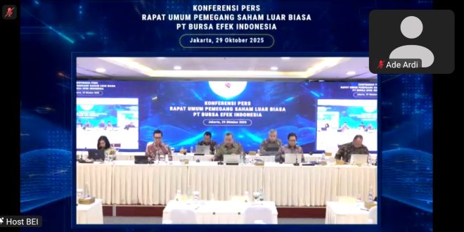 MarketNews.id-PT Bursa Efek Indonesia (BEI) menyelenggarakan Rapat Umum Pemegang Saham Luar Biasa (RUPSLB) Tahun 2025 secara hybrid pada Rabu (29/10) yang dihadiri oleh 92 Pemegang Saham atau 100% dari jumlah pemegang saham pemilik hak suara. Kedua agenda RUPSLB yang disetujui oleh Pemegang Saham, yaitu 1) Persetujuan atas Rencana Kerja dan …