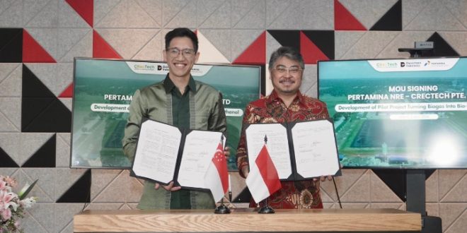 MarketNews.id- Pertamina New & Renewable Energy (Pertamina NRE), semakin serius mengembangkan bisnis energi baru terbarukannya. Hal ini tercermin dari dilaksanakannya penandatanganan Nota Kesepahaman (Memorandum of Understanding/MoU) dengan CRecTech Pte. Ltd. (CRecTech) terkait eksplorasi pengembangan fasilitas percontohan biogas ke biometanol di Kawasan Ekonomi Khusus (KEK) Sei Mangkei di Sumatra, Indonesia.
